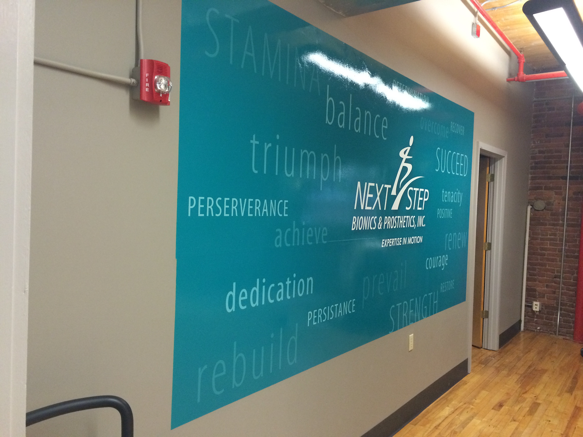 Created a dynamic layout which could be easily adapted to the challenging footprint of each office space. A gallery, museum-style approach was taken in the design. Acrylic, vinyl and nickel finish hardware were recommended for materials so as to weave in a technological and timeless look and feel. The acrylic material used to showcase the client photography varied in size, thickness and distance from the wall. The staggered placement of images and color vinyl squares was meant to mimic the ups and downs that clients experience emotionally on the road to recovery. Images captured moments of motion and achievement – offering motivation and inspiration for those just beginning their journey and accomplishment for those reaching their goals.